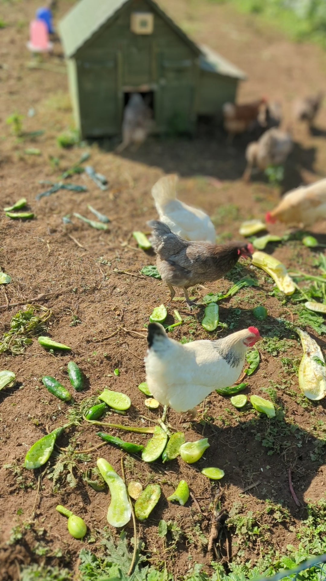 Chickens are omnivores. They love bugs, frogs, snakes, mice and other small creatures along with all kinds of vegetation.